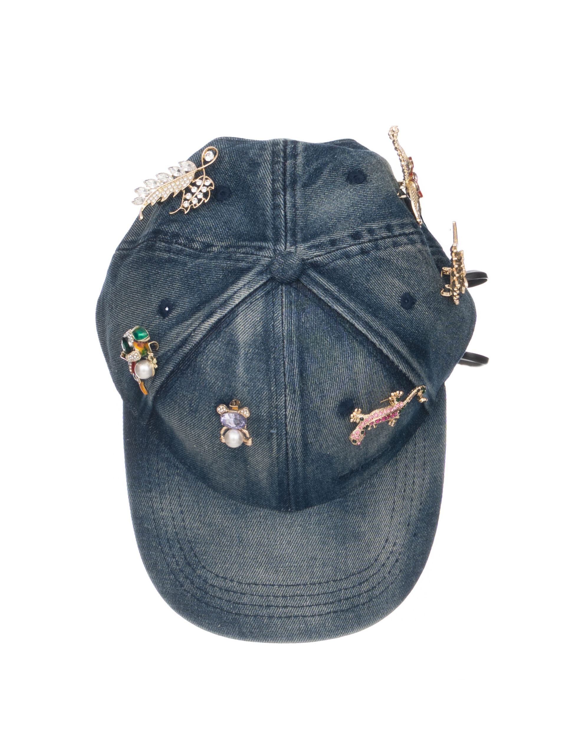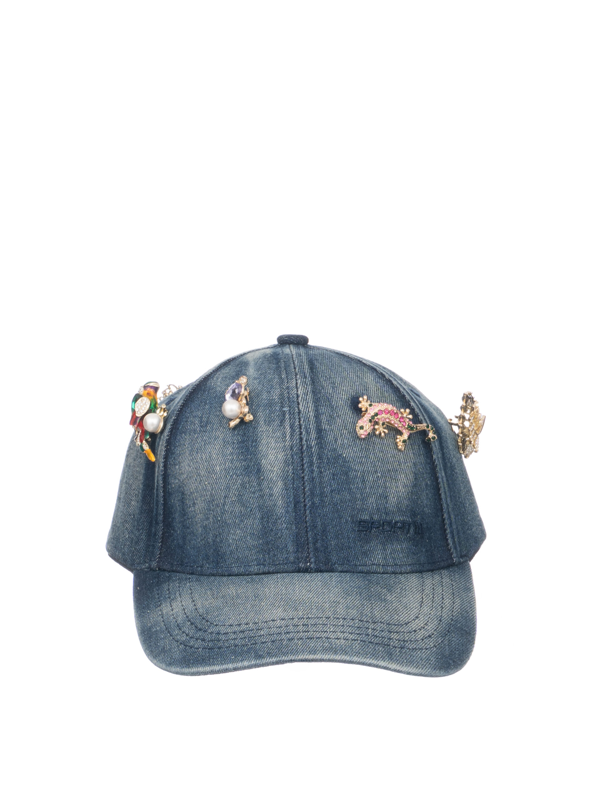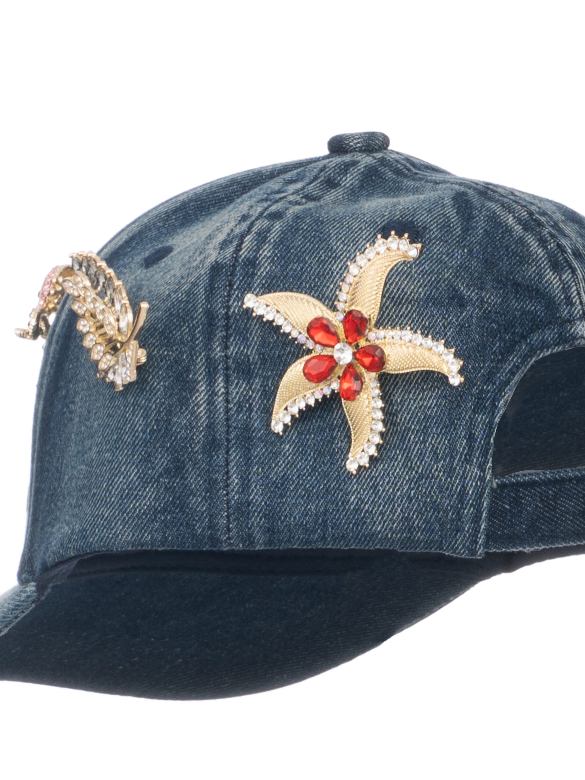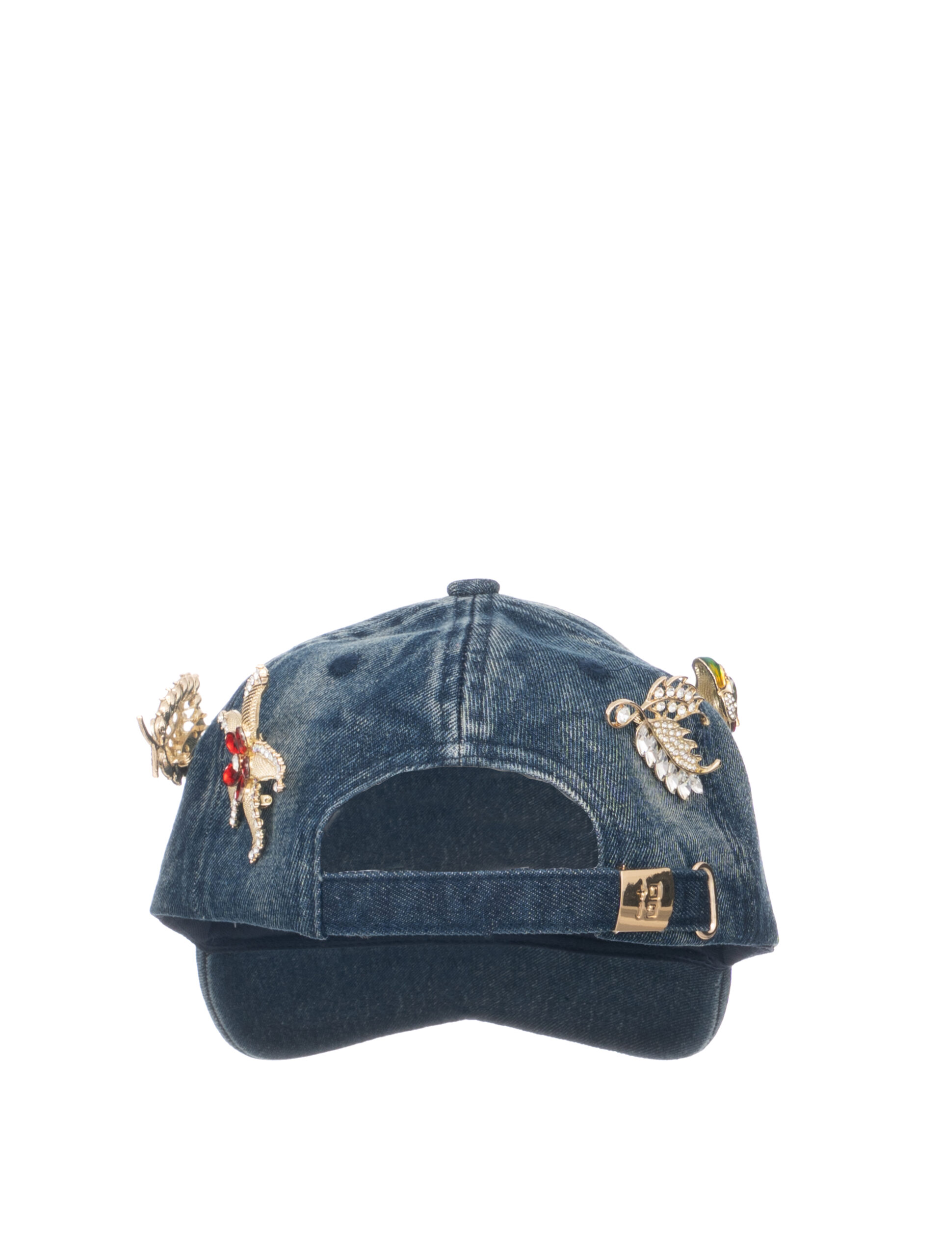 In tessuto jeans scuro con accessori su tutto il cappello